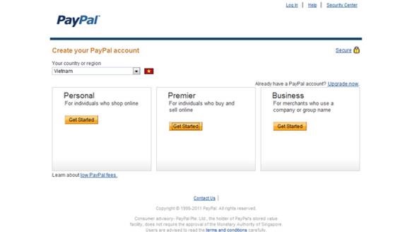Trong khi chờ có thẻ thanh toán online, bạn bắt đầu tiến hành việc đăng ký một tài khoản Paypal.Bạn có thể chọn Personal hoặc Premier theo link sau Paypal và click nút “Sign Up”